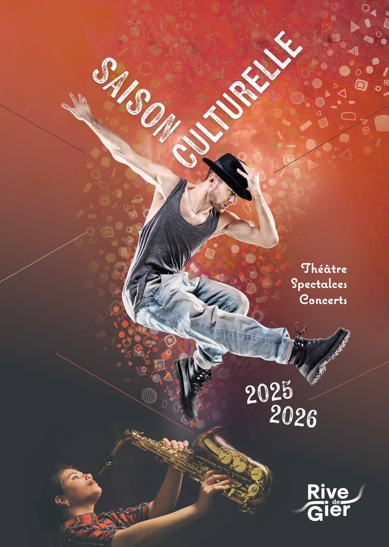 Affiche de la saison culturelle 2025–2026 : saxophoniste et danseur retenant son chapeau.